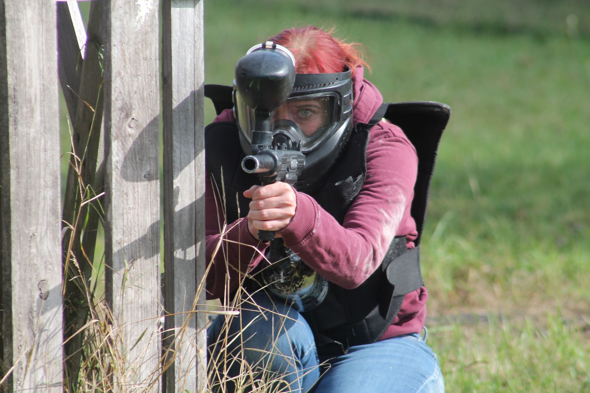 Ihr bekommt spezielle Schutzmasken sowie Markierer mit geringerer Leistung und kleineren Farbkugeln. Schutzwesten und Leibchen gibt es je nach Bedarf.
