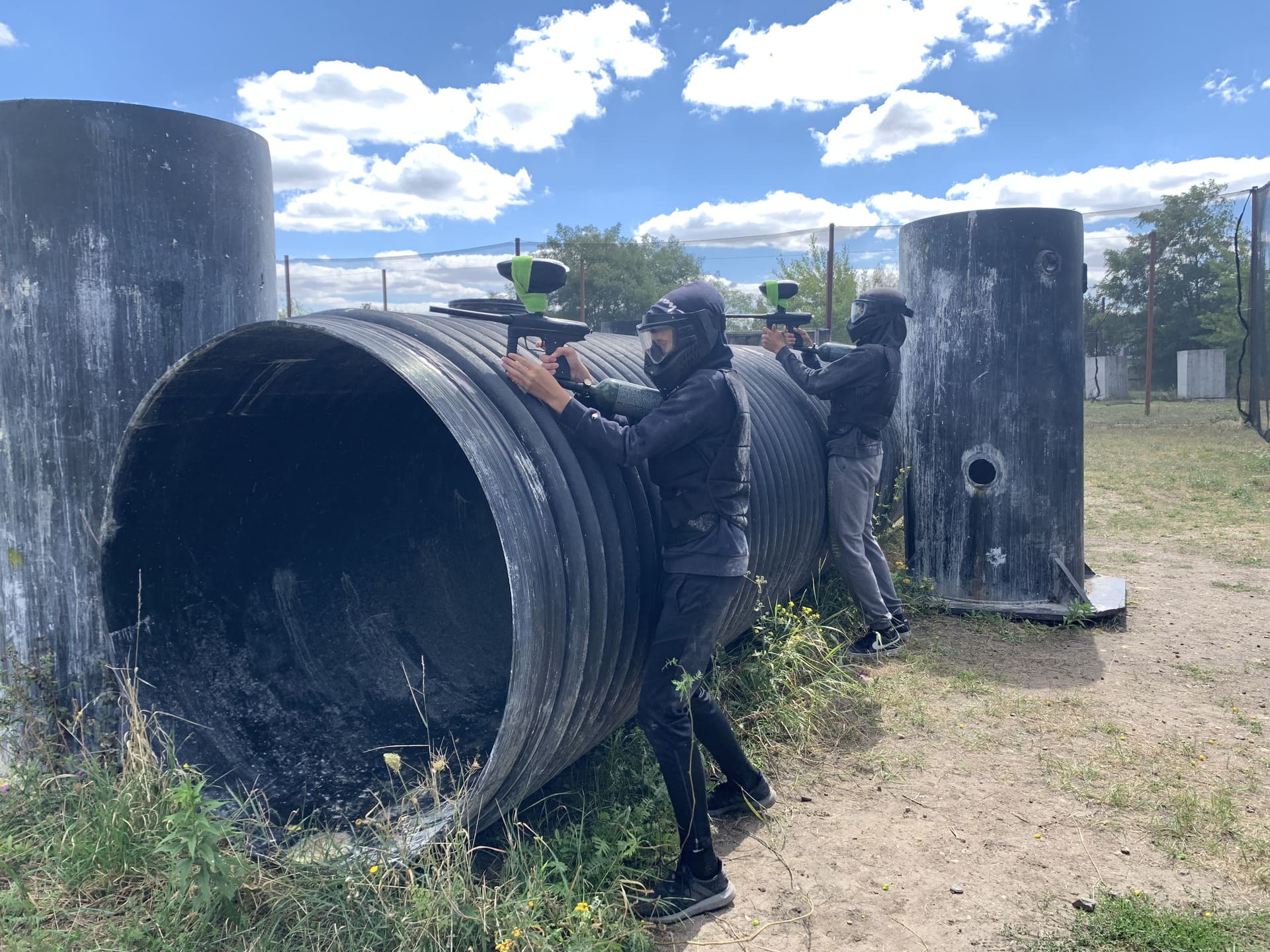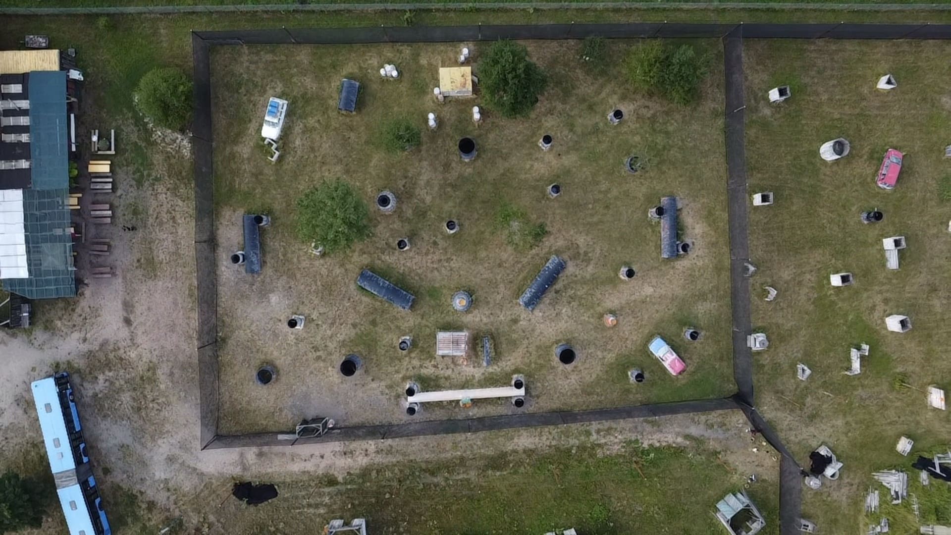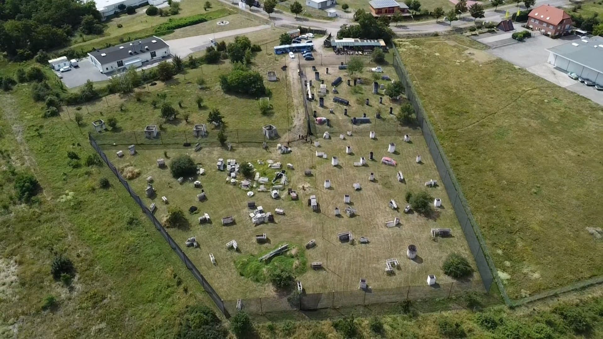 Autowracks, Abflussrohre, Tonnen, Reifen, Bäume und Holzbarrikaden machen das Gelände vielseitig bespielbar und für jede Spielstärke attraktiv.